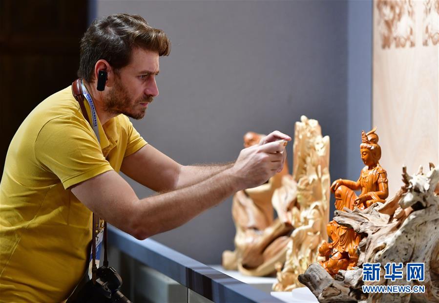 11月23日,来自罗马尼亚的达达勒在拍摄泉州木雕。当日,第二届海上丝绸之路非物质文化遗产展在福建泉州非物质文化遗产馆开幕。新华社记者魏培全摄