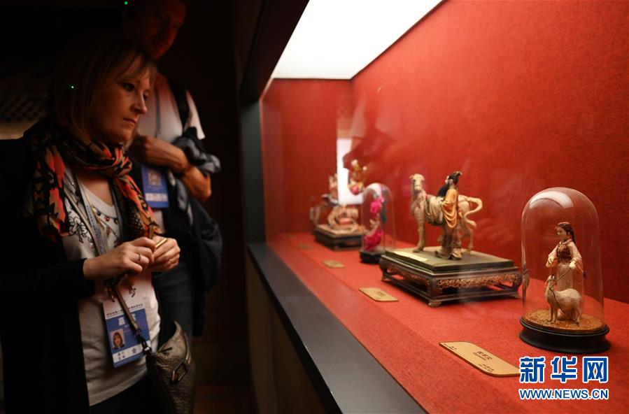 11月23日,外国来宾在观赏彩扎《牧羊女》(右一)。当日,第二届海上丝绸之路非物质文化遗产展在福建泉州非物质文化遗产馆开幕。新华社记者魏培全摄