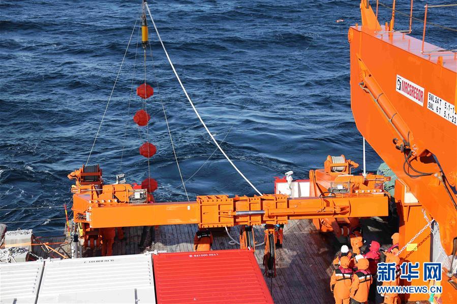 12月4日,中国第36次南极考察队队员在南大洋普里兹湾东侧布放潜标。新华社记者刘诗平摄