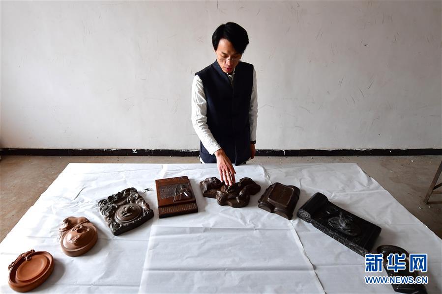 12月6日,在河南孟州市化工镇横山村,李氏黄河澄泥砚第七代传承人李喜阳在展示砚台作品。新华社记者 冯大鹏 摄