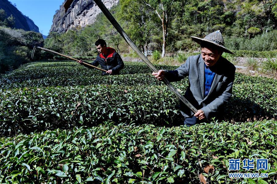 12月9日,福建武夷山市天星村茶农在茶园里除草松土。时值冬日,福建省武夷山市茶农冬闲不闲,忙着管理茶园,加工茶叶。近年来,武夷山市充分发挥当地资源优势,大力发展茶叶生产,众多茶农通过茶叶生产走上脱贫致富之路。新华社记者张国俊摄