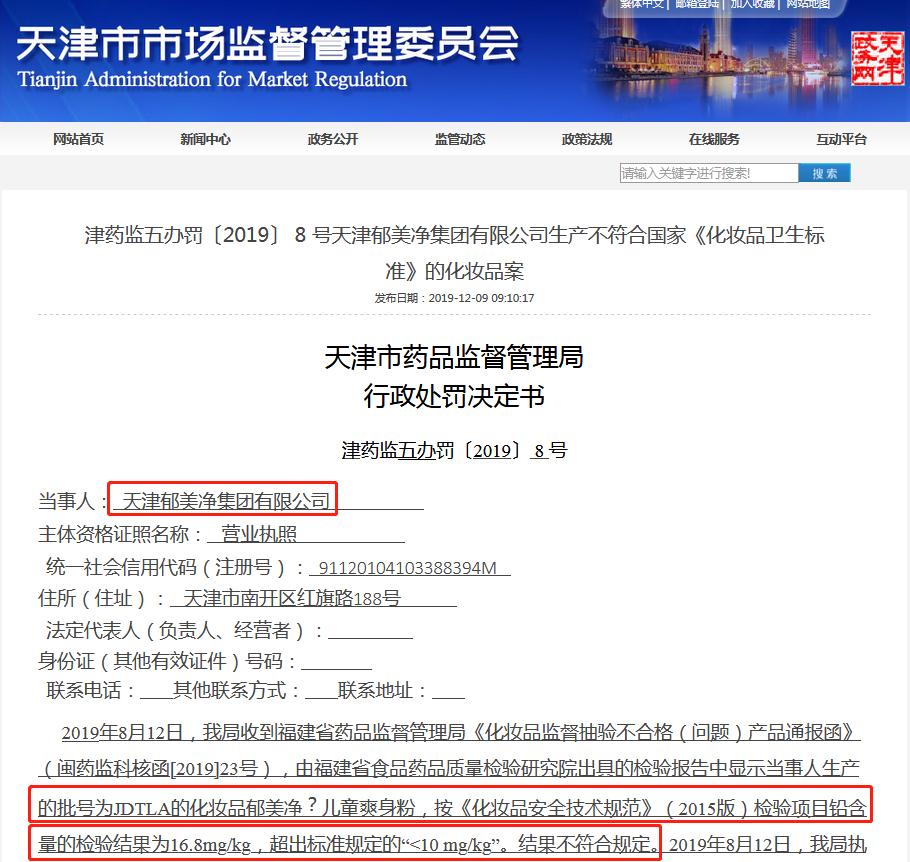 行政处罚决定书显示,当事人生产的3批次化妆品郁美净儿童爽身粉经福建省食品药品质量检验研究院、山西省食品药品检验所、北京市药品检验所、天津市药品检验研究院、山东省食品药品检验研究院按《化妆品安全技术规范》(2015版)检验项目铅含量的检验结果均超出标准规定的“≤10mg/kg”。经查,上述3批次化妆品于2019年2月28日至2019年3月21日生产,共生产40050盒,销售价格为6.6331元/盒,共召回39444盒,其余606盒已全部售出。