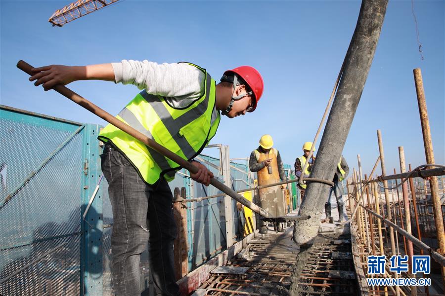 12月15日,中建西部建设贵州公司工作人员在401米高的楼顶浇灌混凝土。新华社记者刘续摄