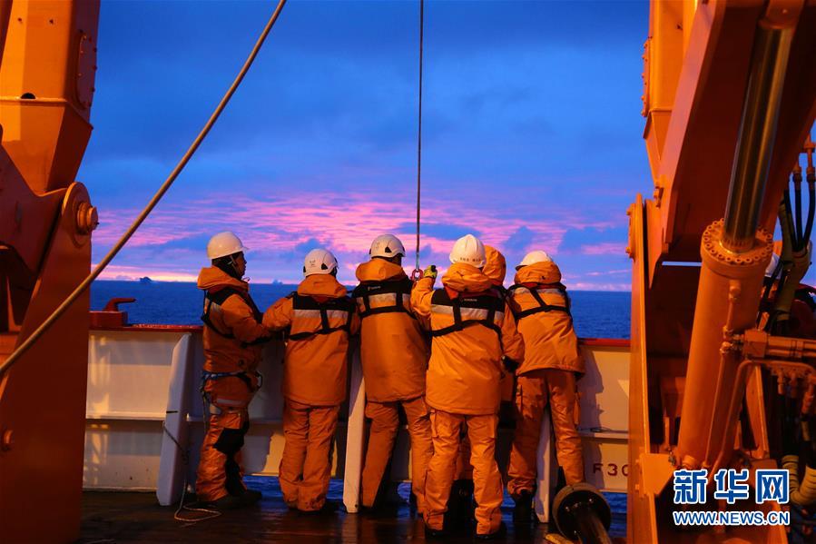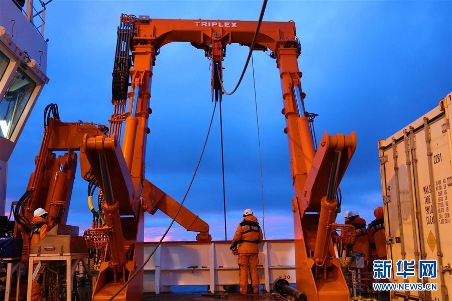 12月15日,科考队员正在回收重力活塞柱状取样器。新华社记者刘诗平摄
