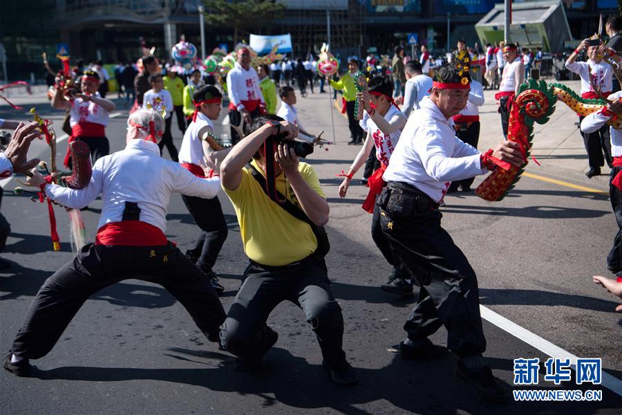 12月8日,关伟铭(黄衣)在澳门“公益金百万行”活动上为“舞醉龙”队友拍照。新华社记者张金加摄
