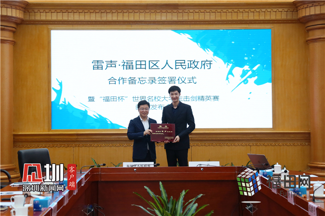 福田区委常委、宣传部长高大伟出席活动并致辞,区委常委、副区长舒毓民代表区人民政府与雷声签署了合作备忘录。此次合作期为5年,这五年间雷声将担任“福田区体育顾问”,为福田区的公共体育事业发展提供决策和咨询;同时发挥个人在国内外的影响力,推动福田对外体育交流,宣传福田体育形象;雷声也会来到福田开展专题公益讲座,为福田的击剑爱好者,特别是青少年提供专业的现场指导,促进福田区击剑运动发展再上一个阶梯。