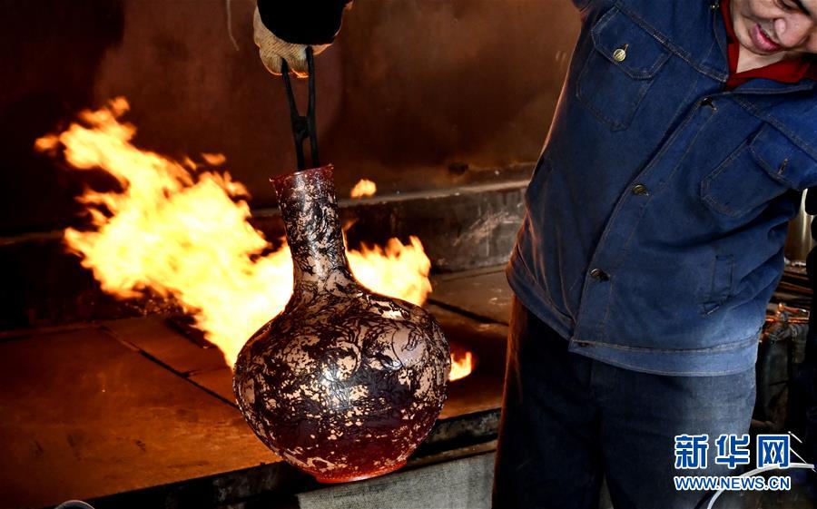 12月12日,技师在北京市珐琅厂有限责任公司的生产基地烧制景泰蓝工艺瓶。 景泰蓝又称“铜胎掐丝珐琅”,是北京特色传统手工艺品之一,也是驰名世界的手工艺品。景泰蓝造型典雅雄浑、纹样繁复、色彩清丽庄重,制作过程集美术、工艺、雕刻、镶嵌、玻璃熔炼、冶金等专业技术为一体,具有鲜明的民族风格和深厚的文化内涵。 景泰蓝自诞生伊始便是宫廷御用珍玩,备受元明清三朝皇室的推崇和喜爱。1956年,北京市珐琅厂有限责任公司成立,这是全国景泰蓝行业中唯一的一家中华老字号,也是国家级非物质文化遗产——景泰蓝制作技艺生产性保护示范基地。在60多年的发展过程中,公司在继承传统技艺的基础上努力创新,培养出一支技术精湛的景泰蓝创作队伍,使古老的景泰蓝工艺品在设计理念和工艺水平上有了新的突破和提高。 新华社记者 李欣 摄