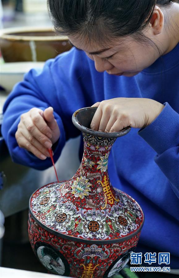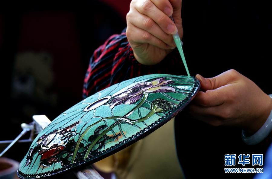 12月4日,北京市珐琅厂有限责任公司的景泰蓝技师在第一遍烧制过的基础上进行第二次上色。 景泰蓝又称“铜胎掐丝珐琅”,是北京特色传统手工艺品之一,也是驰名世界的手工艺品。景泰蓝造型典雅雄浑、纹样繁复、色彩清丽庄重,制作过程集美术、工艺、雕刻、镶嵌、玻璃熔炼、冶金等专业技术为一体,具有鲜明的民族风格和深厚的文化内涵。 景泰蓝自诞生伊始便是宫廷御用珍玩,备受元明清三朝皇室的推崇和喜爱。1956年,北京市珐琅厂有限责任公司成立,这是全国景泰蓝行业中唯一的一家中华老字号,也是国家级非物质文化遗产——景泰蓝制作技艺生产性保护示范基地。在60多年的发展过程中,公司在继承传统技艺的基础上努力创新,培养出一支技术精湛的景泰蓝创作队伍,使古老的景泰蓝工艺品在设计理念和工艺水平上有了新的突破和提高。 新华社记者 李欣 摄