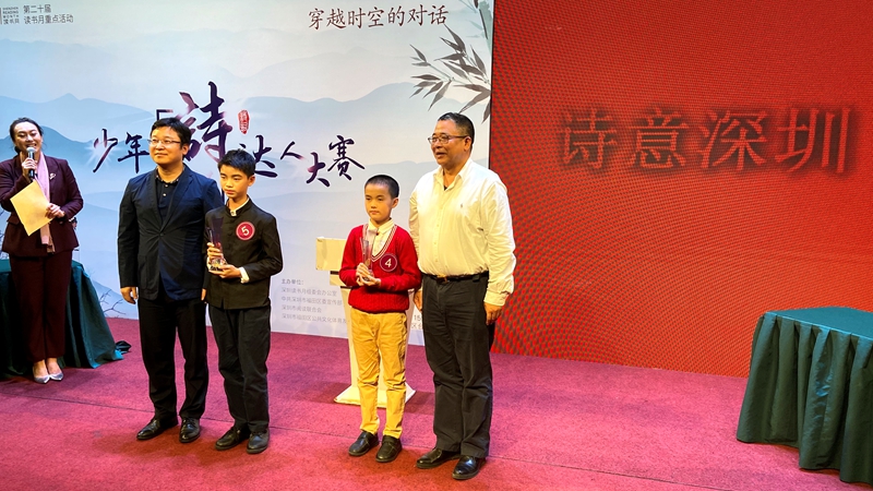 “少年诗词达人大赛”面向深圳市范围内广泛招募少年诗词爱好者。随着初赛、复赛的相继落幕,十名优秀少年选手脱颖而出,并在总决赛上一决胜负。决赛以《小学生必背古诗词75首》、《唐诗三百首》、《千家诗》为主要考查范畴,设置了“诗词联句”、“对错判断”、“诗词知识问答”三个环节。