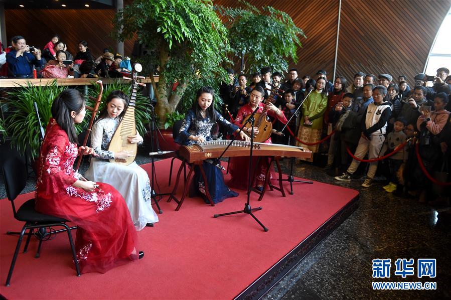 12月22日,观众在国家大剧院西咖啡厅空间舞台欣赏民乐小合奏。当日,国家大剧院迎来建院十二周年公众开放日艺术节,50余场演出和活动精彩亮相,吸引近万名观众前来欣赏。新华社记者罗晓光摄