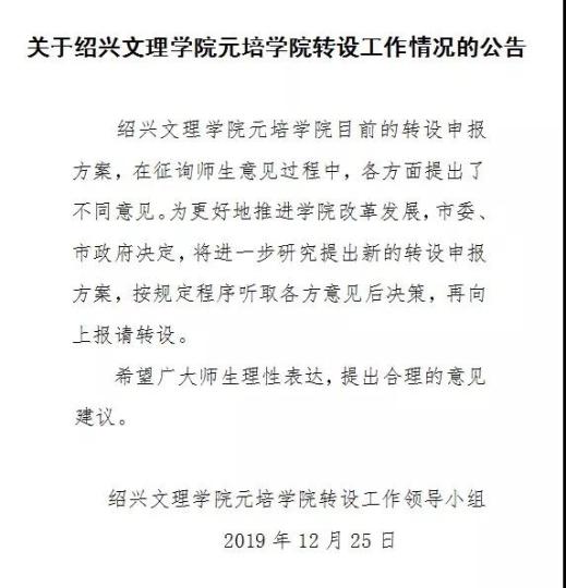 公告中指出,针对当前收集的不同意见,绍兴市委、市政府决定,将进一步研究提出新的转设申报方案,按规定程序听取各方意见后决策,再向上报请转设。