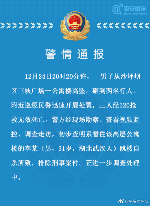 中新网2019年12月25日电 据重庆市公安局沙坪坝区分局官方微博消息,12月24日20时20分许,一男子从沙坪坝区三峡广场一公寓楼高坠,砸到两名行人。附近巡逻民警迅速开展处置,三人经120抢救无效死亡。
