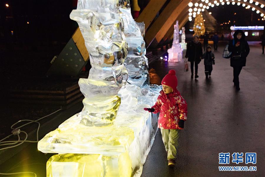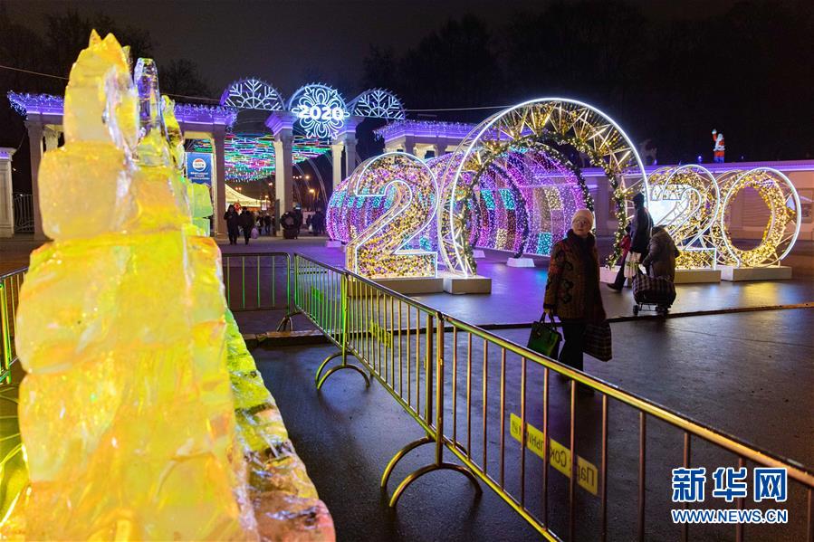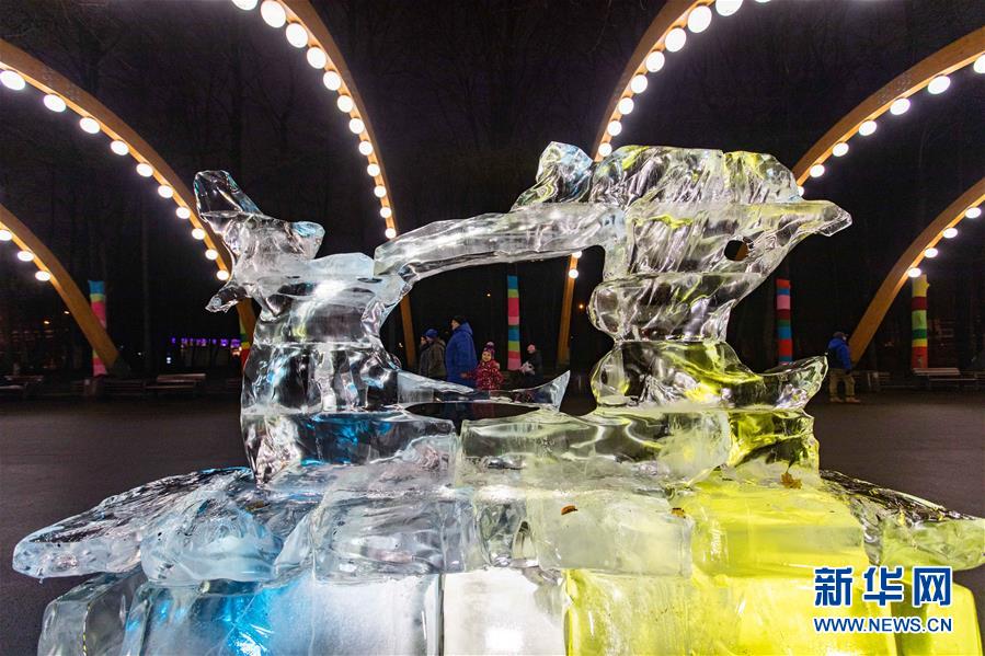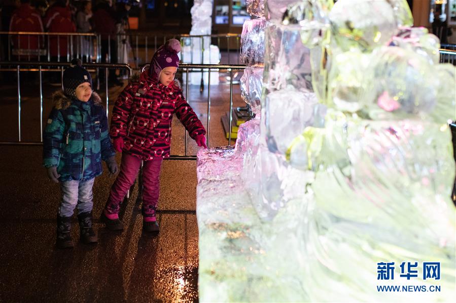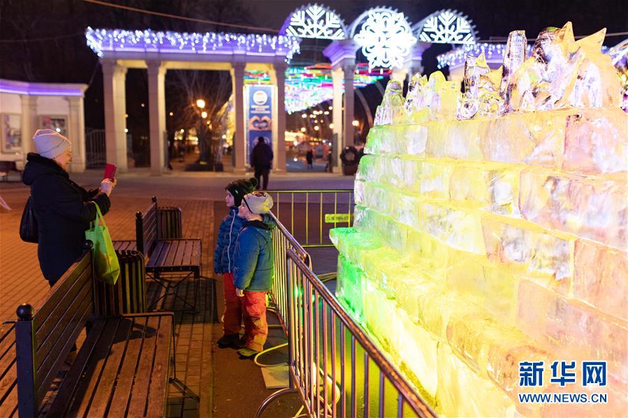 12月24日,在俄罗斯首都莫斯科,人们参观冰雕艺术展。哈尔滨冰雕艺术展24日在莫斯科开幕,现场展出了哈尔滨大剧院、防洪纪念塔以及莫斯科红场建筑群等惟妙惟肖的冰雕作品,吸引众多游客驻足拍照。参加本次冰雕艺术展的十名冰雕师提前抵达莫斯科,以新中国成立70周年、中俄建交70周年、“一带一路”倡议等为主题,为莫斯科民众奉上了精美的新年礼物。新华社记者白雪骐摄