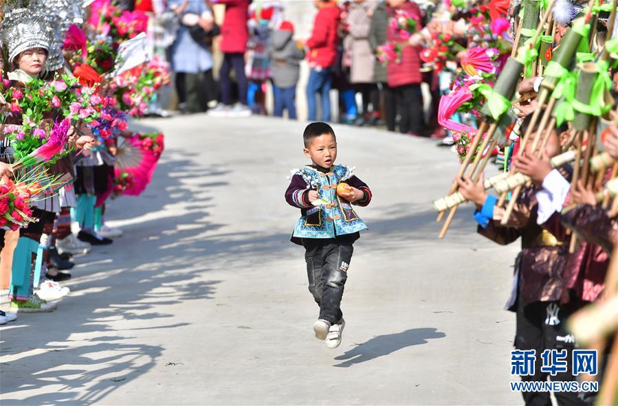 12月27日,在广西柳州市融水苗族自治县杆洞乡党鸠村乌英苗寨,5岁的吴良友在苗年活动现场。新华社记者黄孝邦摄