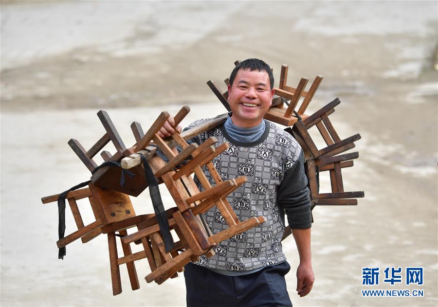 12月27日,在广西柳州市融水苗族自治县杆洞乡党鸠村乌英苗寨,村民卜志良挑着小板凳参加百家宴。新华社记者黄孝邦摄