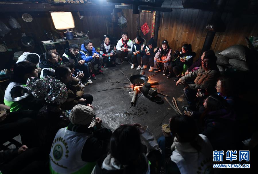 12月27日,在广西柳州市融水苗族自治县杆洞乡党鸠村乌英苗寨,澳门青年艺能志愿工作会的义教老师们在喝油茶。新华社记者王诺摄