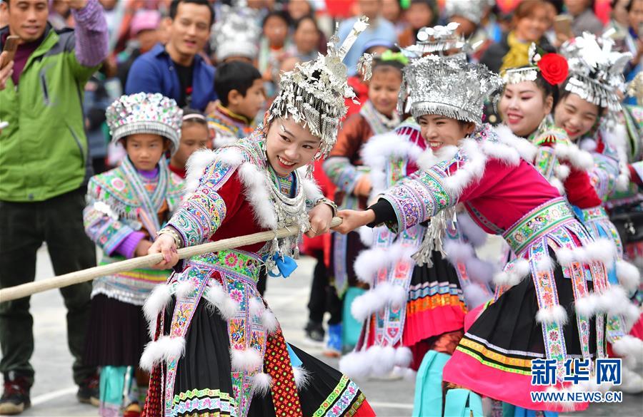 12月27日,在广西柳州市融水苗族自治县杆洞乡党鸠村乌英苗寨,苗族姑娘在拔河比赛中。新华社记者黄孝邦摄