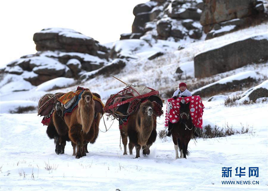 12月29日,牧民在牧业冬季大转场表演中赶骆驼。当日,第二届萨吾尔冬牧文化旅游节在新疆吉木乃县草原石城景区开幕。新华社记者沙达提摄