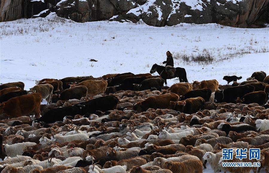 12月29日,牧民在牧业冬季大转场表演中驱赶畜群。当日,第二届萨吾尔冬牧文化旅游节在新疆吉木乃县草原石城景区开幕。新华社记者宋彦桦摄