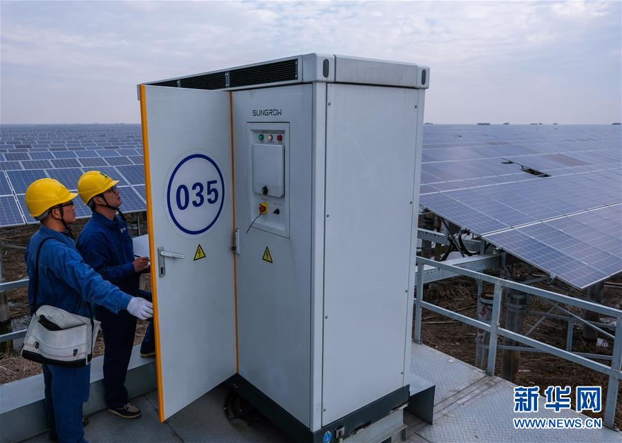 12月29日,工作人员检查海涂光伏发电设备。当日,浙江省内规模最大的海涂渔光互补光伏发电项目在慈溪市龙山镇正式投运。该项目总水域面积5800余亩,设置光伏板120余万块,总装机容量340兆瓦。预计年均发电量约3.75亿千瓦时,全部并入国家电网。新华社记者徐昱摄