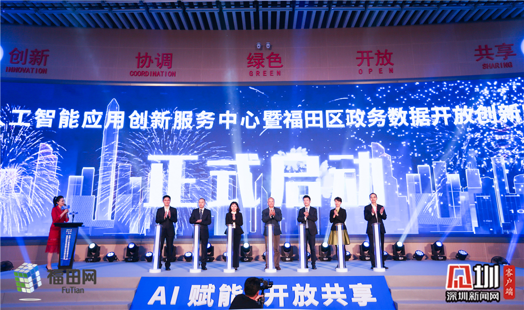 中国工程院杨小牛院士,福田区委副书记、区长黄伟等领导和嘉宾一起宣布深圳人工智能应用创新服务中心暨福田区政务数据开放实验室正式启动。