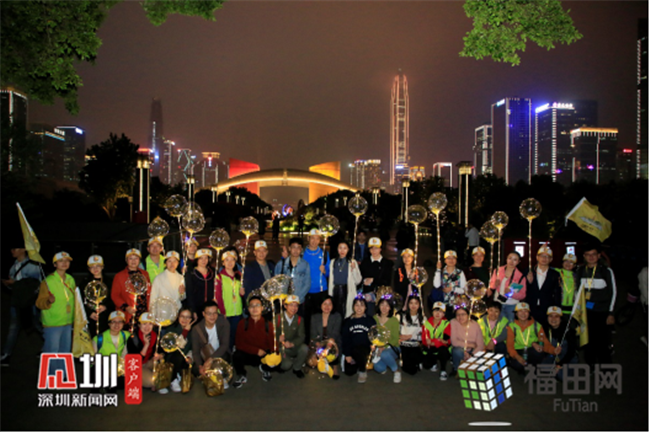 2019年12月31日晚上七点半,“荧光徒步”城市导览之旅酷炫启动!50名参与者一起徒步深圳中轴线,从南中轴线上的皇庭广场空中花园,一路向北,途经中心城、绿色的云、欣欣向荣的葵花园、深南大道、市民中心、中心书城屋顶空中步行道,直达莲花山公园山顶广场,林立于中轴线两侧的大中华、平安金融中心、十三姐妹楼、深圳音乐厅、深圳图书馆、少年宫、深圳市当代艺术与城市规划馆等地标性建筑物尽收眼底。