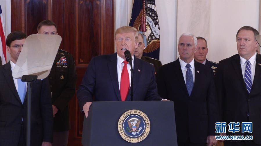 1月8日,美国总统特朗普(中)在华盛顿白宫发表电视讲话。美国总统特朗普8日说,伊朗对驻有美军的伊拉克军事基地发动的袭击未造成美方人员伤亡,美方将立即对伊朗实施新的经济制裁。新华社记者胡友松摄