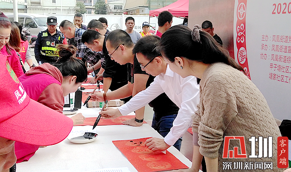 深圳新闻网2020年1月12日讯(见圳客户端、深圳新闻网记者 谢燕丽 通讯员 余勇 叶晓林)1月12日下午,艳阳高照,温暖如春。凤凰街道举办的以“墨韵呈祥文明景 瑞鼠迎春福禧年”为主题的义写春联活动在明安花园举行,至此,凤凰街道已在辖区5个社区巡回开展了义写春联活动,凤凰街道党工委书记和光明区书协多名书法家一起磨墨挥毫,向市民赠送春联2000余副。