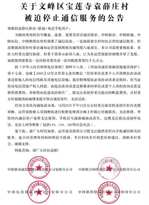中新网记者向三大运营商核实该公告是否属实,某运营商表示,公告属实,对此事不再回应。据了解,上述村庄为河南省安阳市文峰区宝莲寺袁薛庄村。公开消息显示,该村为文明村。
