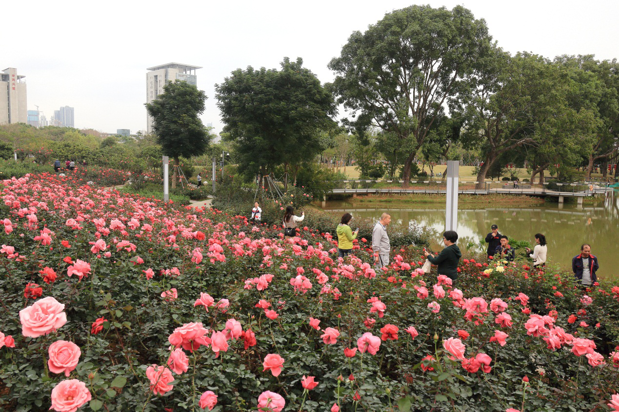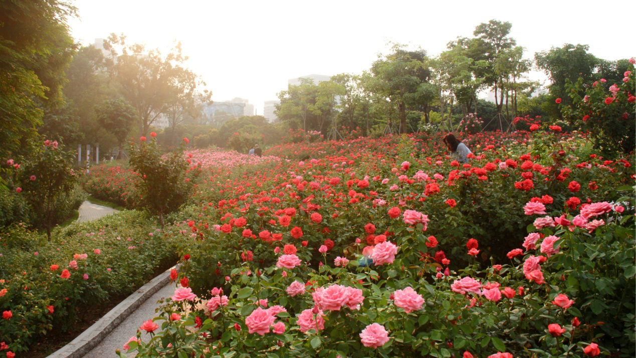 香蜜公园素有有“深圳最美公园”“都市绿肺”等美称,空中栈道、自然展览厅、花香湖、花蜜湖,各色湖景、林景给繁忙都市带来一阵绿色的清新。临近春节,香蜜公园的又一美景——“玫瑰园”即将迎来月季盛花期。香蜜公园玫瑰园主园占地近8000平方米,种植面积4200平方米,月季种类方面有20多种地被月季以及近300株树桩月季。盛开的月季与中西结婚礼堂相呼应,这里的花事带着一抹爱情的甜味。