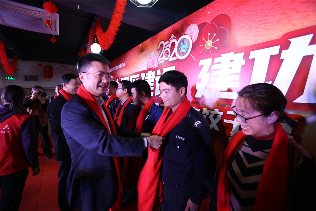 黄伟等区领导为职工代表和劳模工匠围上红围巾,祝愿他们新年红红火火。