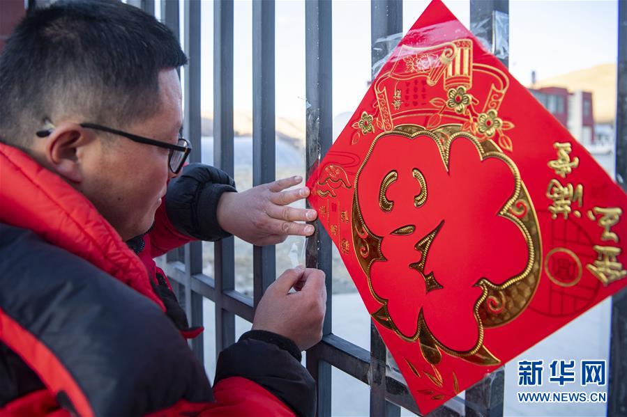 席振华在观测站的大门上贴福字(1月24日摄)。新华社记者孙非摄