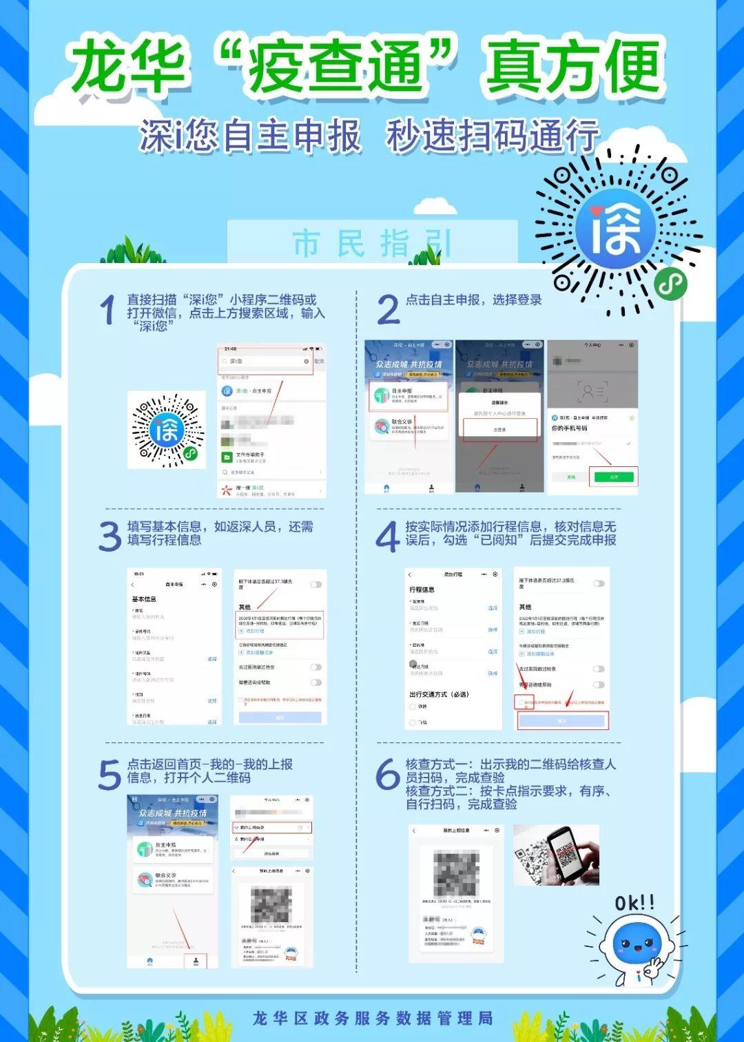 为全力打赢疫情防控阻击战,龙华区运用“智慧龙华”成果研发了“疫查通”APP,将于近期全面上线,支持卡点核查等工作。请广大居民朋友支持配合,先按下图指引完成“深i您”自主申报,生成个人二维码。在进出小区、企业、城中村等卡点时,请主动出示您的个人二维码,核查人员将通过“疫查通”扫码查验;您也可以按照核查人员指引,自行扫描张贴的“疫查通”二维码,主动参与完成查验。