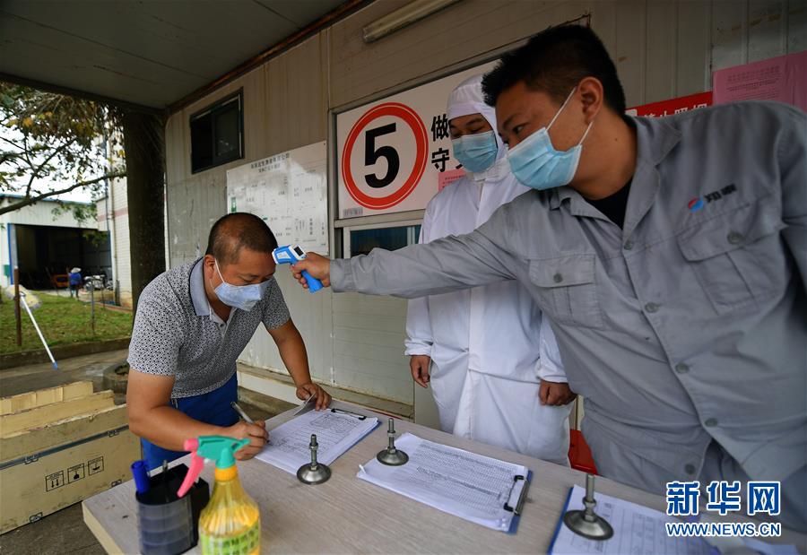 2月18日,海南翔泰渔业的工作人员为货车司机测量体温。近日,在严格落实疫情防控措施的前提下,海南水产品出口企业陆续复工复产,产能逐渐恢复。新华社记者郭程摄