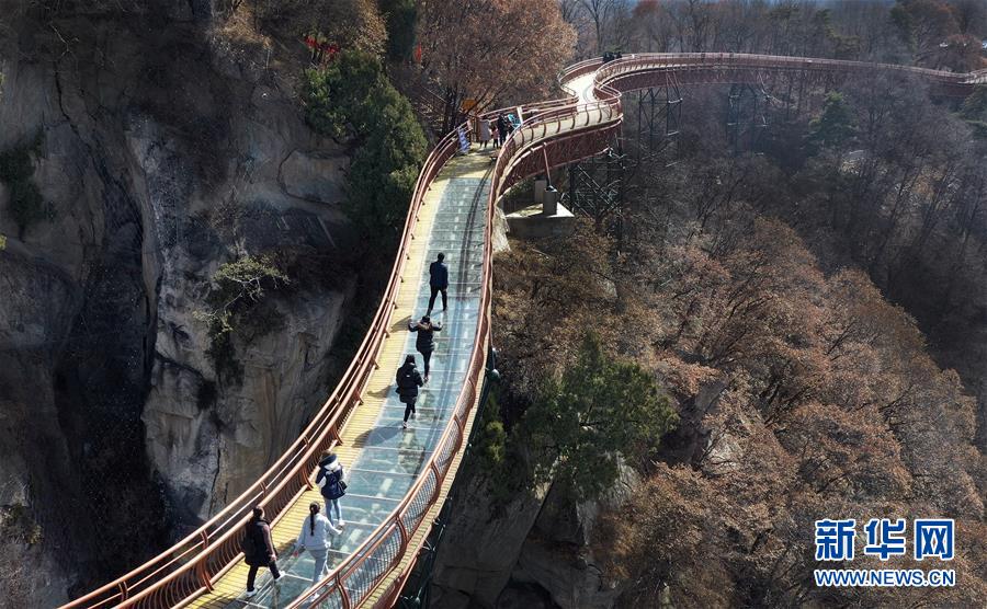 2月22日,游客在少华山玻璃栈道游玩(无人机照片)。当日,封闭近一个月的陕西少华山国家森林公园在景区范围内进行消杀作业后重新对外开放。新华社记者陶明摄