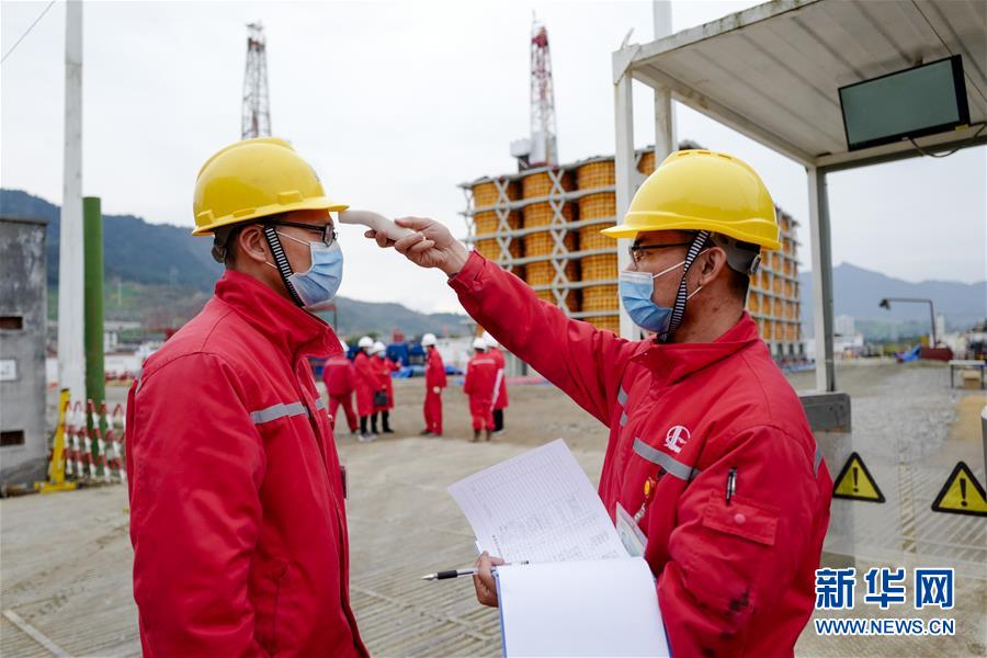 2月22日,中石化重庆页岩气有限公司胜页2压裂试气与钻井同平台井场进出口,井场值班员(右)对进入井场工作的工人进行体温测量和信息登记。