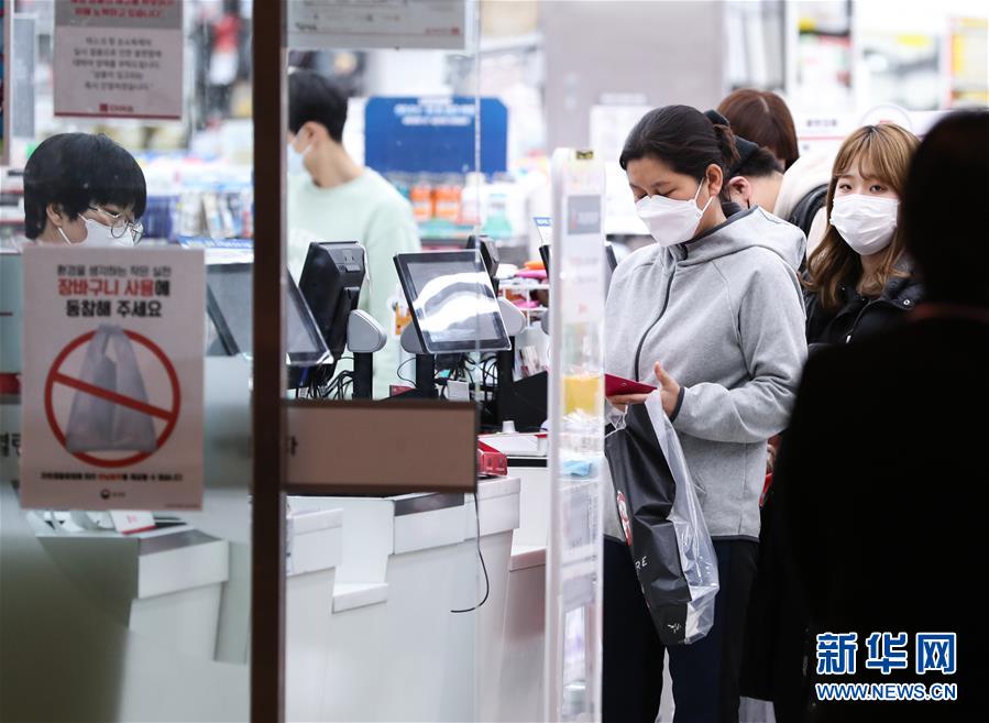 2月24日,在韩国首尔,当地居民在龙山区一家日用品商店排队结账。韩国疾病管理本部24日最新通报说,当地时间24日9时至24日16时,韩国新增70例新冠病毒感染病例,累计确诊病例增至833例;新增死亡病例1例,累计死亡8例。新华社记者王婧嫱摄