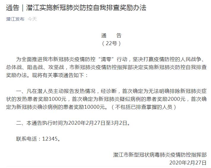 中新网2020年2月27日电 据湖北省潜江市人民政府办公室官方微信公众号消息,潜江市新型冠状病毒肺炎疫情防控指挥部2月27日发布通告,凡在潜人员主动报告发热情况,经诊断,首次确定为新冠肺炎确诊病例的患者奖励10000元。