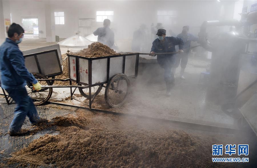 2月27日,陕西柳林酒业集团有限公司的员工在酿酒车间作业。近期,陕西宝鸡市凤翔县的酿酒企业在做好疫情防控的同时,调配人员,有序组织复工复产。新华社记者陶明摄