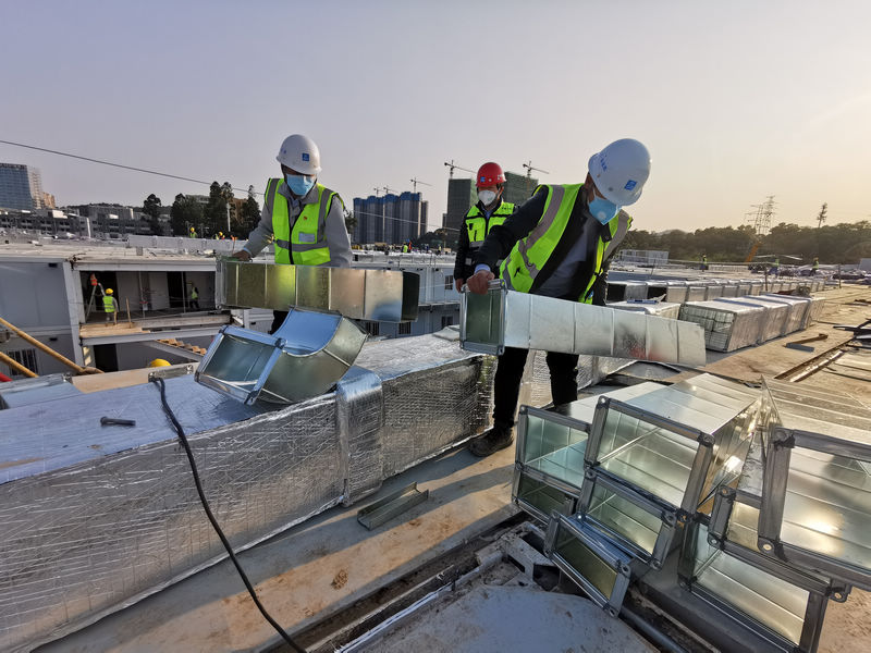 据悉,该院区总建筑面积5.9万平方米,设置1000余个床位。特殊时期,仅用20天就完成了两年的工作量。其中,中建八局参与了应急院区的东三区建设,用7天时间便完成了电气、暖通、给排水等安装任务,用央企担当让“深圳速度”再加速。