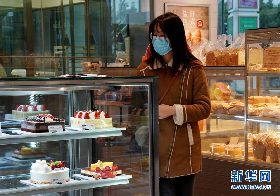 3月1日,顾客在上海一家糕点店内选购蛋糕。据2月29日上海市新冠肺炎疫情防控新闻发布会上的消息,上海商业企业加速复工。目前,上海的超市卖场累计开业接近100%,购物中心和百货企业95%左右已正常营业,电商行业主要企业已全部复工。与此同时,上海在积极推动家政服务、餐饮服务和美容美发等与居民生活密切相关的生活性服务业加快复工进度。新华社记者刘颖摄