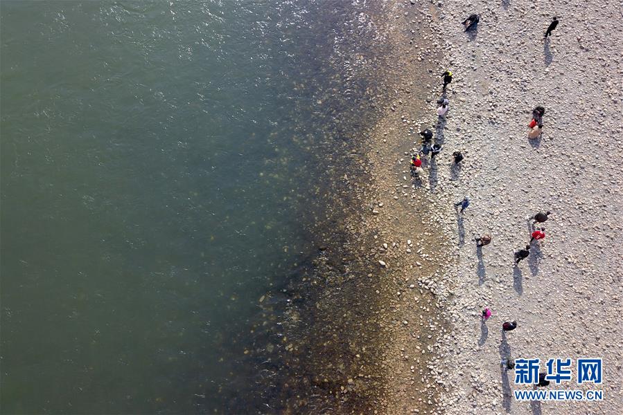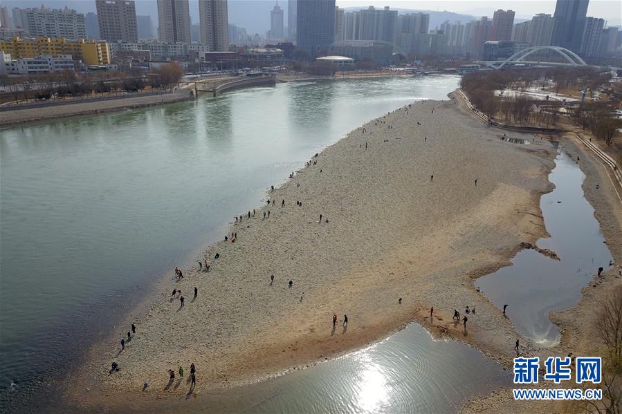 3月3日,市民在黄河兰州段河床上散步(无人机照片)。近日,受黄河上游来水量较少等因素影响,黄河兰州段水位持续下降,出现部分河床“露底”现象。新华社记者范培珅摄