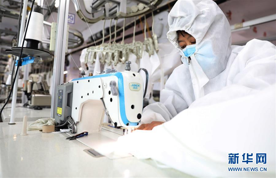 3月3日,在辽宁融贸制衣有限公司,工人在生产车间里缝制医用隔离服。新华社记者姚剑锋摄