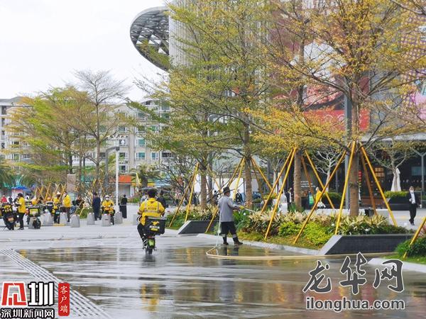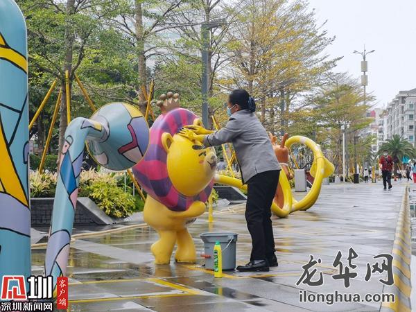 龙华壹方天地商场外工作人员正在清洗美陈雕塑。