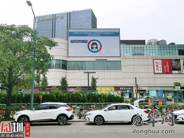 龙华星河iCO电子显示屏上循环播放着疫情防控宣传标语和科普视频。