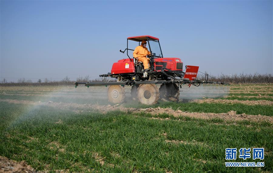 3月4日,建建农机合作社社员在蒲城县椿林镇平峨村驾驶自走式高杆喷雾机为小麦喷洒除草杀菌剂。近日,为确保疫情期间不误农时,陕西省蒲城县植保植检站组织县内7家农作物病虫害专业化防治单位,在小麦返青起身期,对麦田进行除草及病虫害的防控工作。新华社记者李一博摄