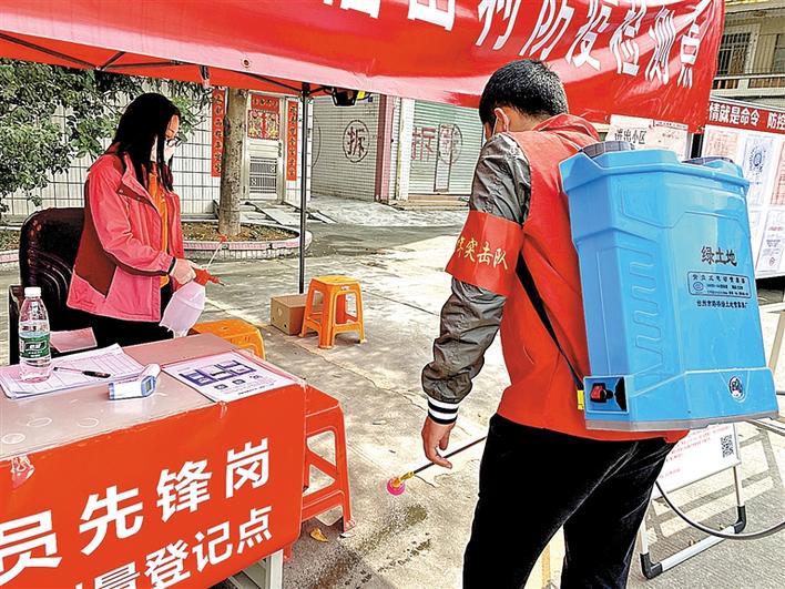 观湖志愿者在辖区进行消杀。记者 陈建华 通讯员 李学文 摄