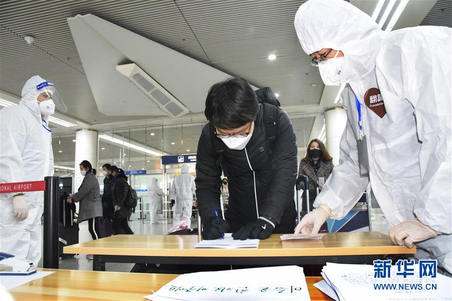 3月5日,青岛流亭国际机场,工作人员在协助入境旅客填写个人信息登记表。为严防疫情输入风险,山东省青岛市在机场等入境口岸加强了防控措施、风险评估和口岸检疫。新华社记者李紫恒摄