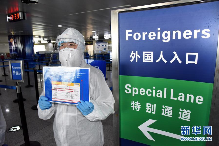 3月5日,青岛流亭国际机场,一名边检工作人员在提示外国旅客填写《外国人入境卡》。为严防疫情输入风险,山东省青岛市在机场等入境口岸加强了防控措施、风险评估和口岸检疫。新华社记者李紫恒摄