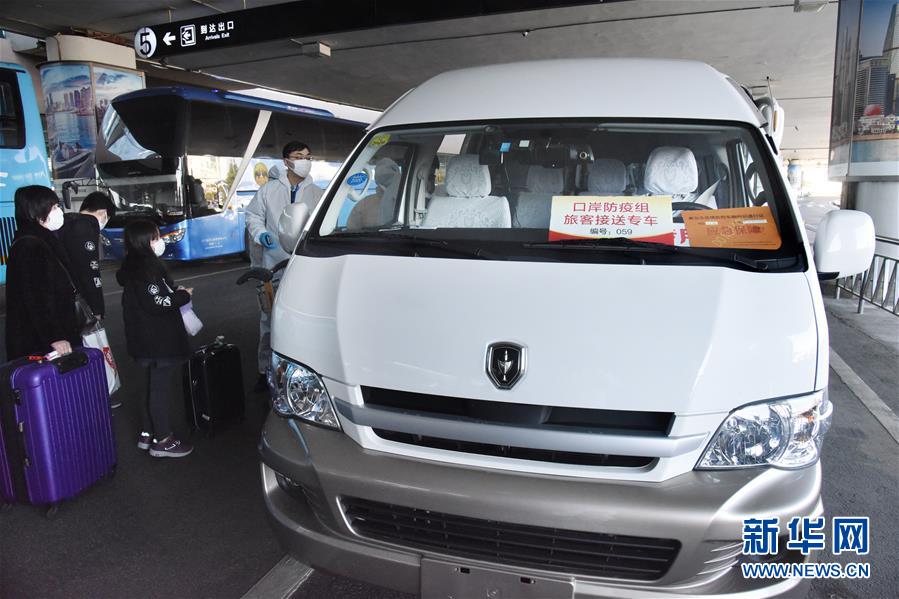 3月5日,青岛流亭国际机场,来自青岛市市南区的工作人员将该辖区旅客接回。为严防疫情输入风险,山东省青岛市在机场等入境口岸加强了防控措施、风险评估和口岸检疫。新华社记者李紫恒摄